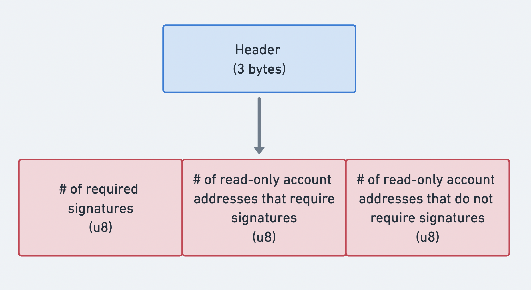 pub struct MessageHeader {/// The number of signatures required for this message to be considered/// valid. The signers of those signatures must match the first/// `num_required_signatures` of [`Message::account_keys`].pub num_required_signatures: u8,/// The last `num_readonly_signed_accounts` of the signed keys are read-only/// accounts.pub num_readonly_signed_accounts: u8,/// The last `num_readonly_unsigned_accounts` of the unsigned keys are/// read-only accounts.pub num_readonly_unsigned_accounts: u8,}